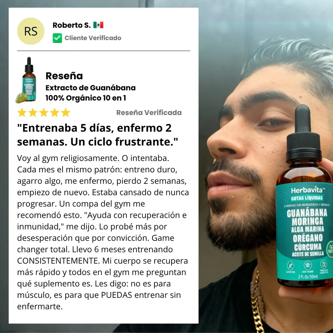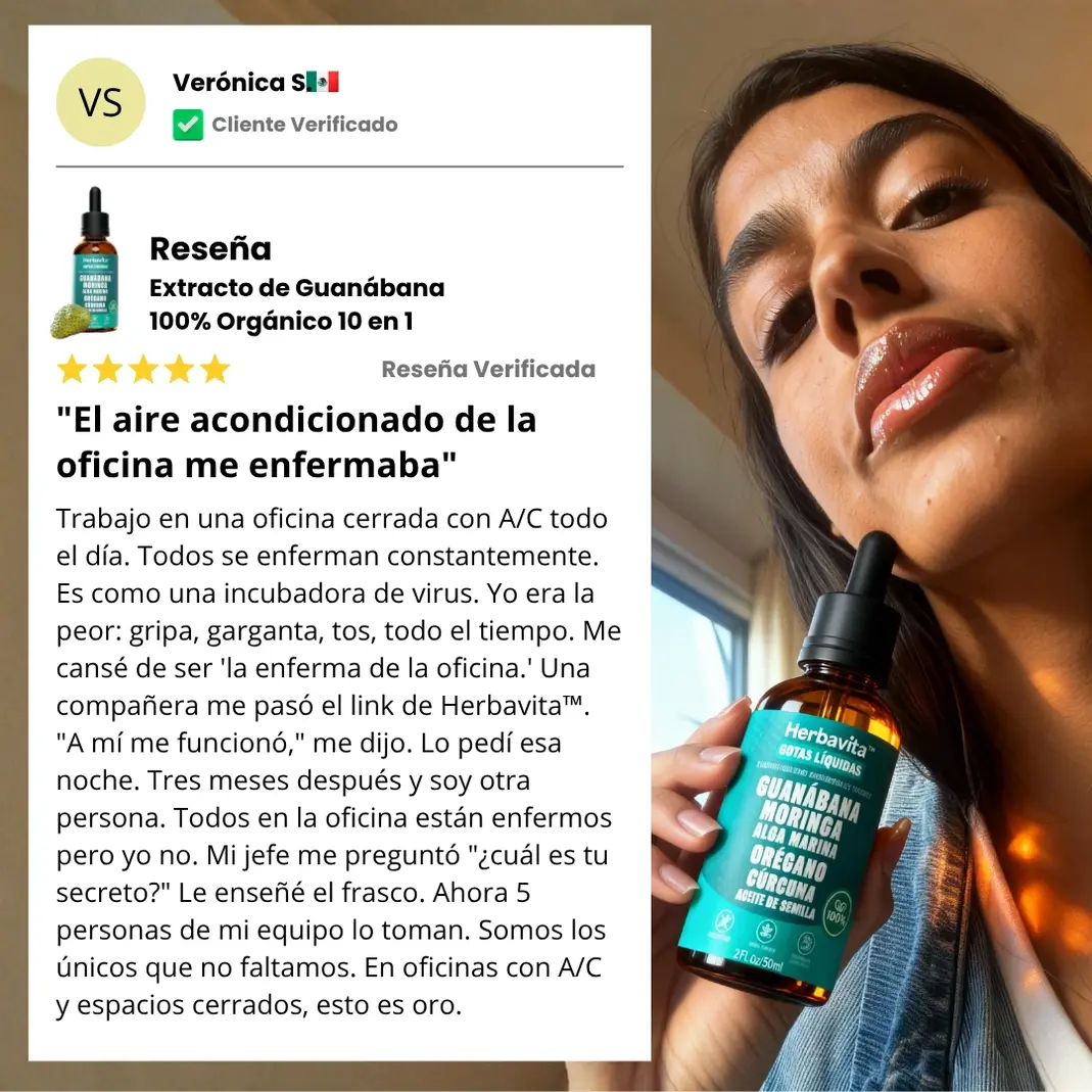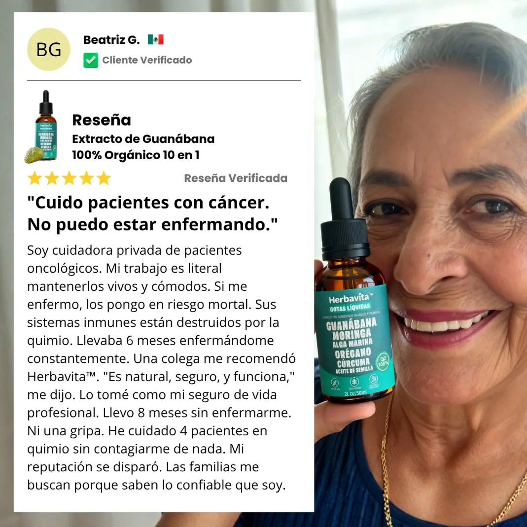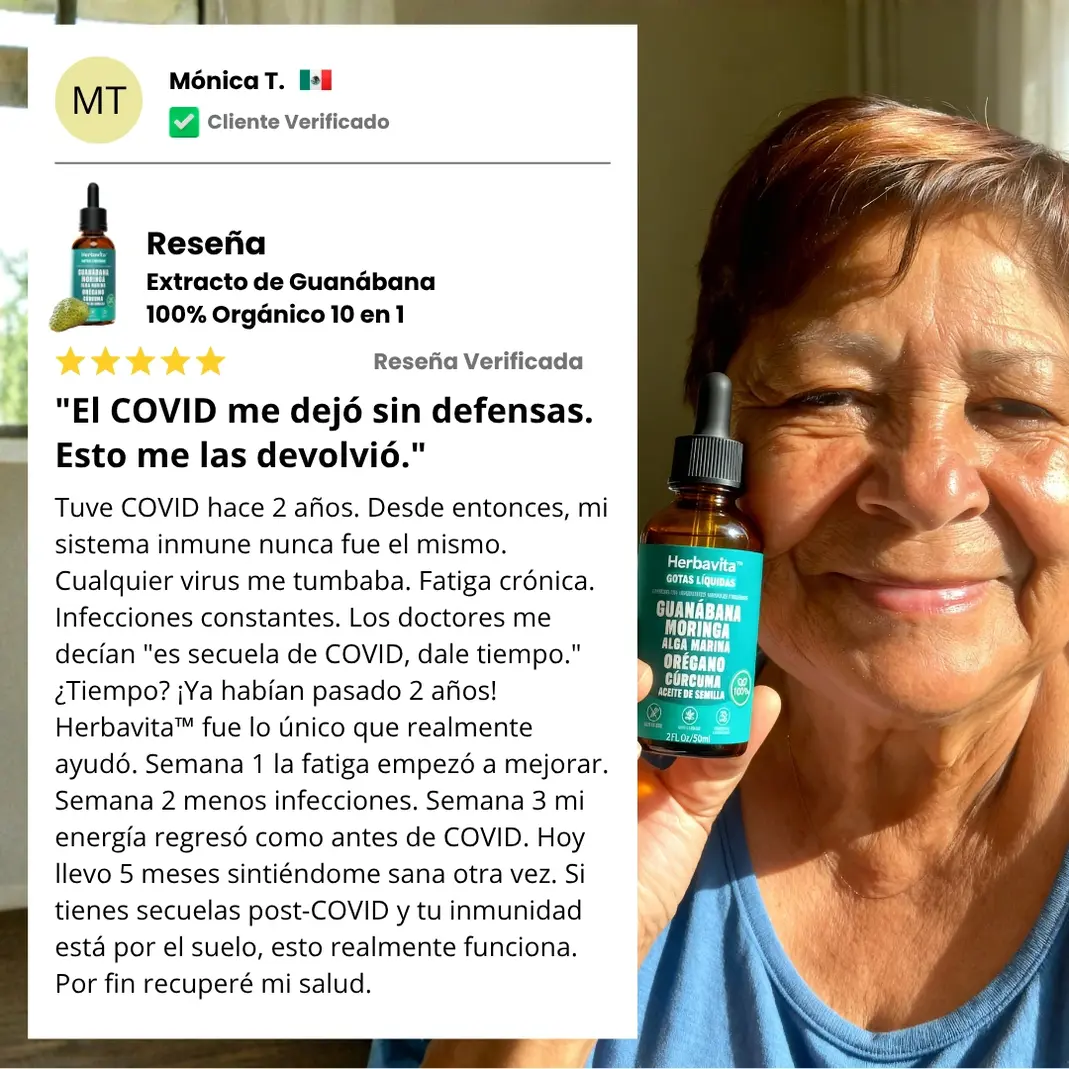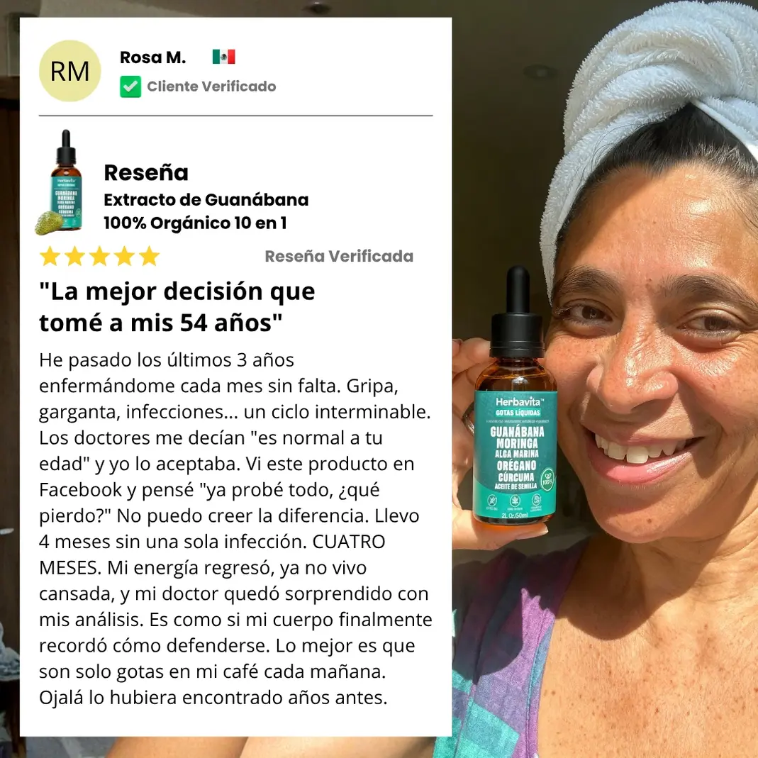 "Gripa cada tres semanas durante dos años. 14 incapacidades en un año. Antibióticos constantes que solo me debilitaban más. El extracto de guanábana fue lo único que realmente fortaleció mis defensas. Tres meses tomándolo y mi cuerpo dejó de colapsar constantemente. Seis meses después no he tenido ni un resfriado. Mi sistema inmune finalmente funciona. Puedo vivir sin miedo de enfermarme todo el tiempo."